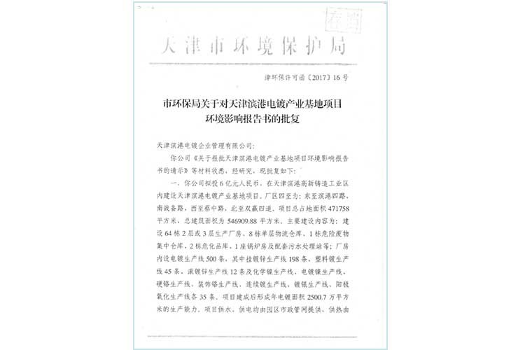 天津德威金属表面处理有限公司是由天津市十里堡电镀有限公司投资新建的全资子公司,成立于2017年,公司位于天津滨港高新铸造工业区双赢道5号;目前总占地面积5000余平米,地面建筑物面积8000余平方米,总投资3500万元。 主要电镀工艺:镀锌、镀锌镍、磷化、化学镍、铝氧化、静电喷涂等。 天津德威金属表面处理有限公司入驻天津滨港电镀产业基地后,由基地采用统一规划、统一建设、统一运营的管理模式实行废水集中治理、废气集中监控,废渣集中管控的管理模式进行运营。